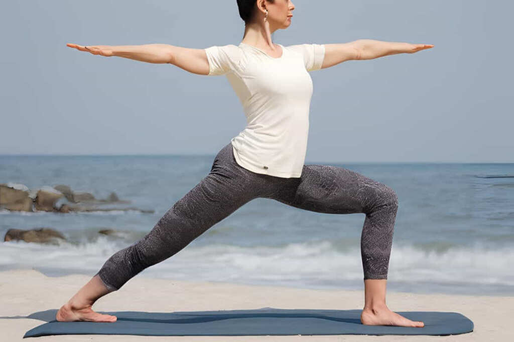 In piedi, da Tadasana, inspirare a compiere un salto aprendo le gambe di circa un metro, tenendo i piedi paralleli. Ruotare la gamba destra di 90 gradi all’esterno, espirando ruotare tutto il busto verso la gamba, girando un poco la gamba sinistra all’interno. Inspirando, allungare il busto e le braccia verso l’alto ed irrigidire la gamba sinistra. Espirando, piegare il ginocchio destro ad angolo retto, in modo che il ginocchio non superi la punta del piede. Il capo è rivolto verso l’alto, gli occhi verso i palmi delle mani unite. Ripetere sul lato sinistro.
