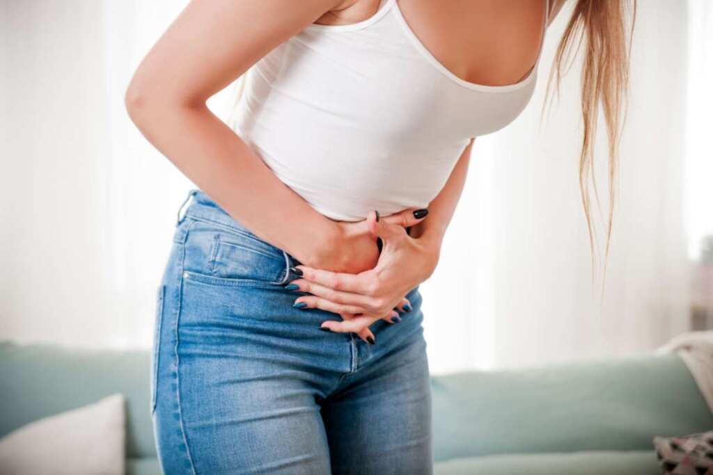 Young female at home suffering from abdominal pain, close up
