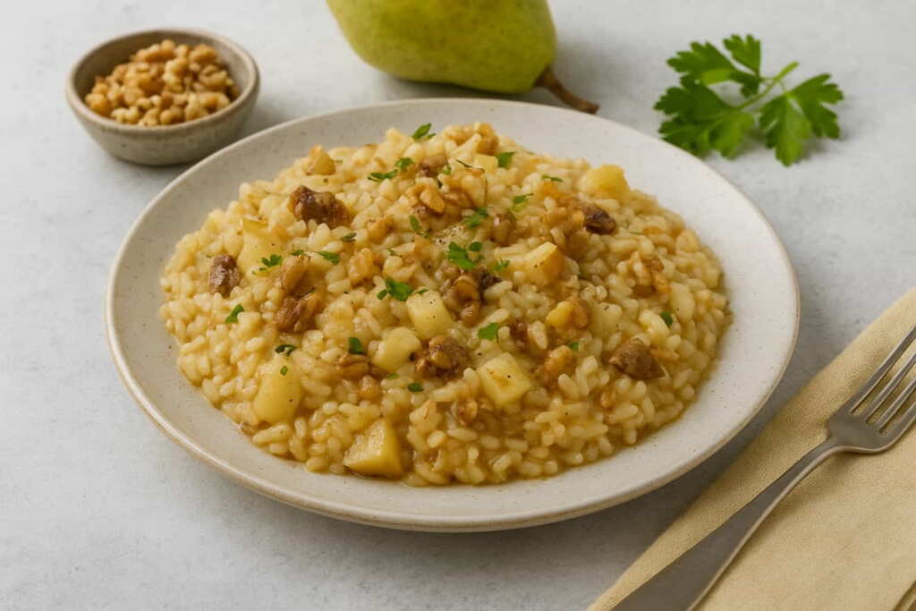 Se amate i piatti che giocano sui contrasti dolce-salato e cercate un primo elegante ma non complicato, il risotto pere...