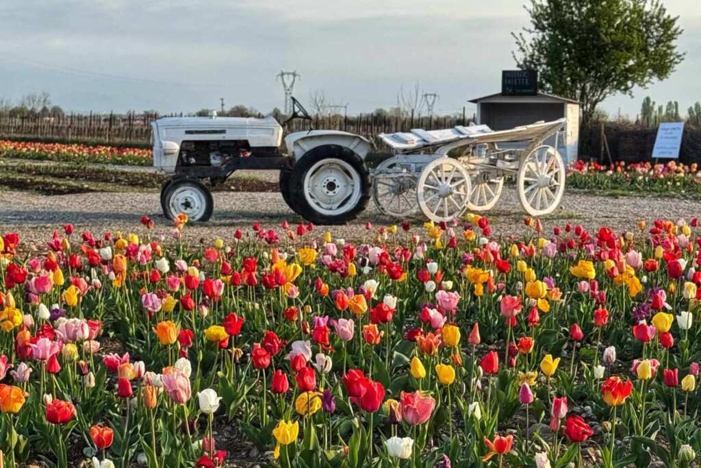 La struttura di Villorba non nasce esclusivamente con i tulipani, è un’impresa agricola con agriturismo e punto vendita aziendale, operativa durante tutto l’anno, che coltiva e lavora materie prime di propria produzione. Il Villaggio delle Zucche, realizzato in autunno, rappresenta l’altra manifestazione stagionale più conosciuta. I campi di tulipani si inseriscono in questa filosofia di esperienze legate ai cicli agricoli — non come attrazione isolata, ma come componente di un’offerta che mira a riavvicinare le persone ai ritmi della terra.